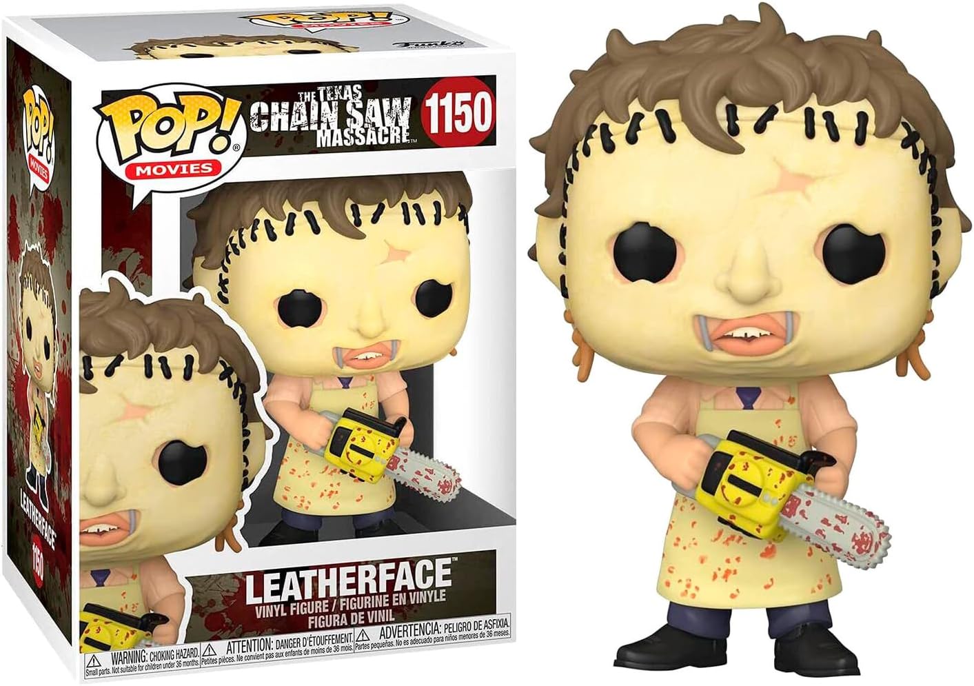 This Texas Chainsaw Massacre Leatherface Funko Pop! Vinyl Figure #1150 measures approximately 3 3/4-inches tall. Comes packaged in a window display box. Ages 3 and up.