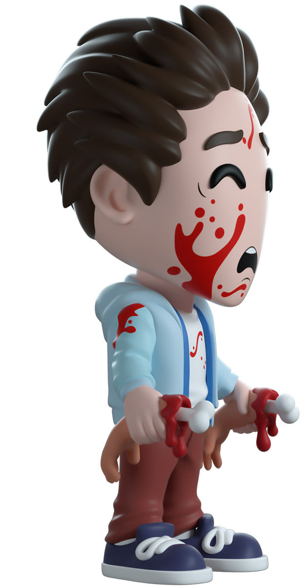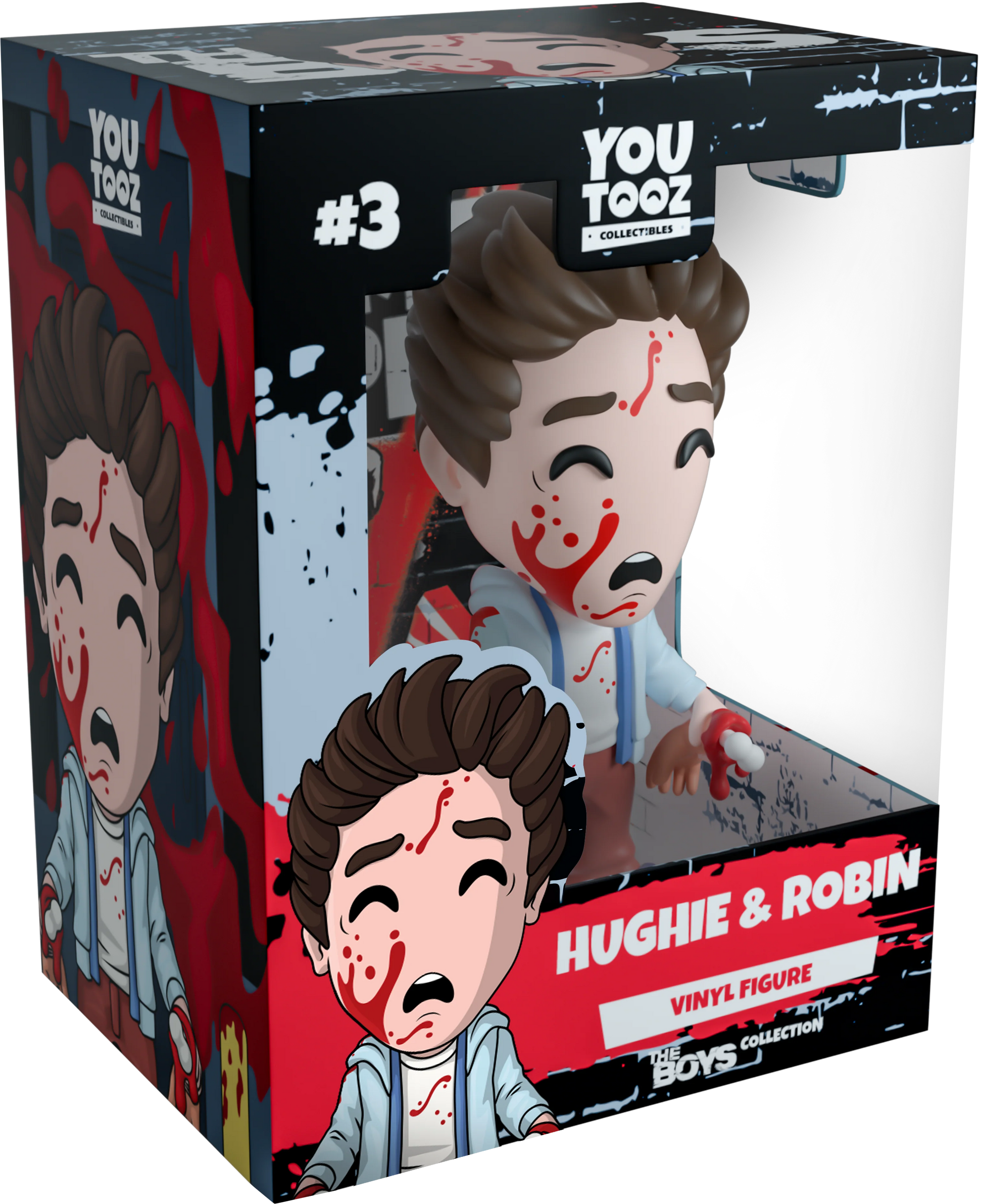 Hughie and uh..Robin, or at least what’s left of her, are here to make their Youtooz debut! Standing in pure shock at 4.8 inches tall with a horrified looking blood smattered face and swept back brown hair, Hughie holds onto what he has left of Robin, just her two disembodied hands with their bones sticking forward. Wearing a blue hoodie and shirt, along with brown pants and dark shoes, his bright white t-shirt has a streak of vibrant blood running across its front. The exterior of his packaging sees Hughie holding what’s left of Robin’s hands over a bloody sidewalk. The interior surrounds him in a graffiti scrawled white brick wall that continues onto the protective sleeve with blood stains, as his figure can be seen through the large clear window at the packaging’s front. This collectible ships in a matte, embossed, protective outer sleeve and a custom sized plastic protector for maximum protection during shipping.